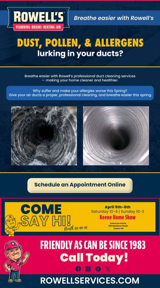 "Friendly As Can Be Since 1983!" When you need help with your plumbing, drains, heating, cooling or electrical in Weare, you can always rely on Rowell's Services! Call us now or book online!