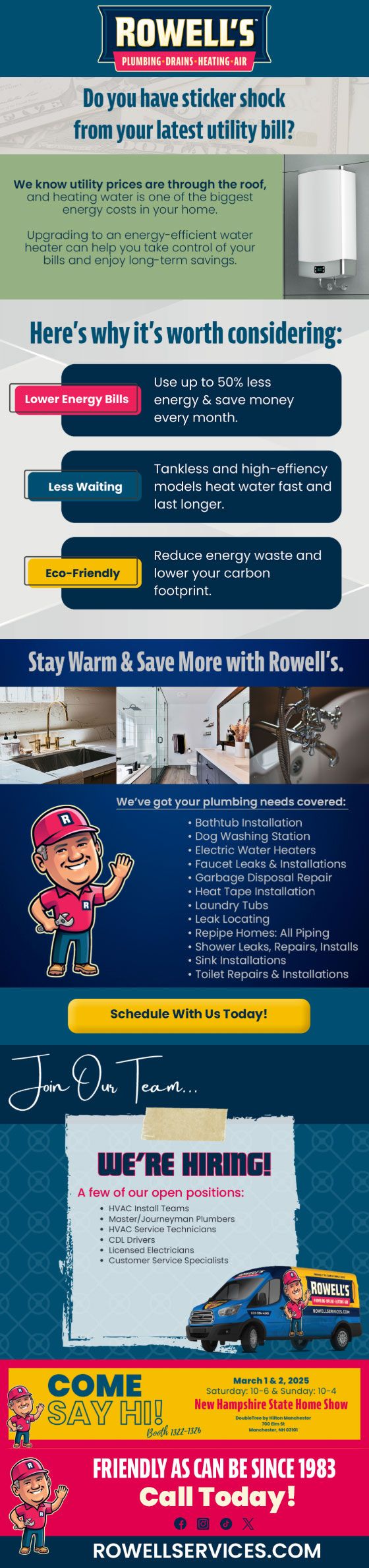 "Friendly As Can Be Since 1983!" When you need help with your plumbing, drains, heating, cooling or electrical in Weare, you can always rely on Rowell's Services! Call us now or book online!